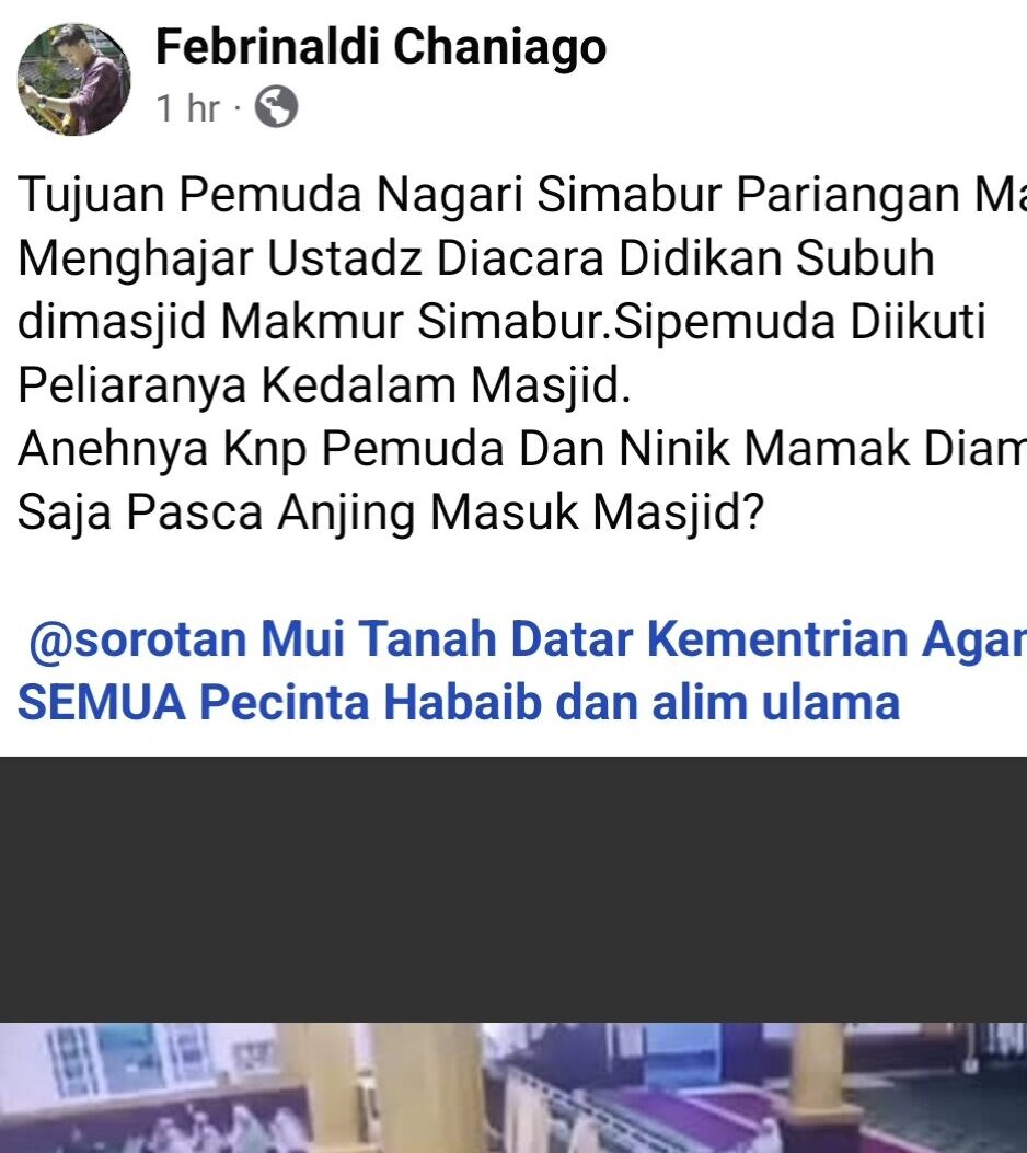 Simabur,Tanah Datar, www.newsantara.my.id,-akun FB FC telah menggiring opini publik untuk mempersalahkan niniak mamak simabur dengan menyebar video yang sudah diselesaikan oleh KAN, WALI NAGARI, BPRN dan niniak mamak nagari Simabur yang mengatakan bahwa pemuda MA tidak bersalah karena sebut saja MA tidak membawa anjing ke simabur,j dan dapat dilihat dalam video tersebut bahwa MA lah yng mengeluarkan anjing dari dalam masjid tersebut.