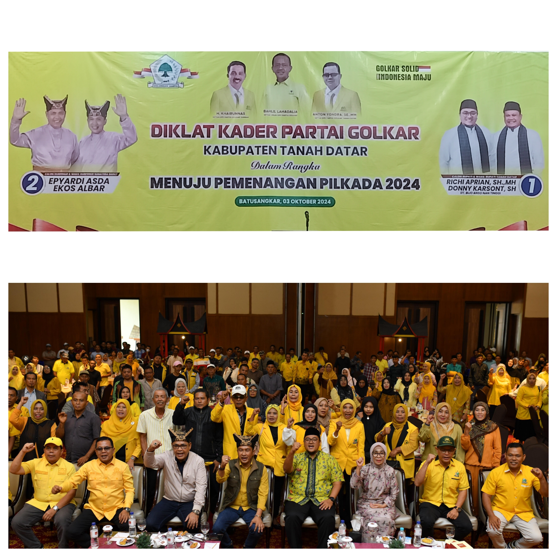 Batusangkar,Tanah Datar,- NEWS-ANTARA,_Kader Golkar Tanah Datar berbondong bondong hadir mendukung Calon Gubernur Sumatera Barat Epyardi Asda-Ekos Albar bersama Calon Bupati Tanah Datar Richi Aprian- Donny Karsont dalam kegiatan Diklat Kader Partai Golkar Tanah Datar menuju pemenangan Pilkada 2024 di Emersia Hotel Batusangkar, Kamis (03/10/2024).