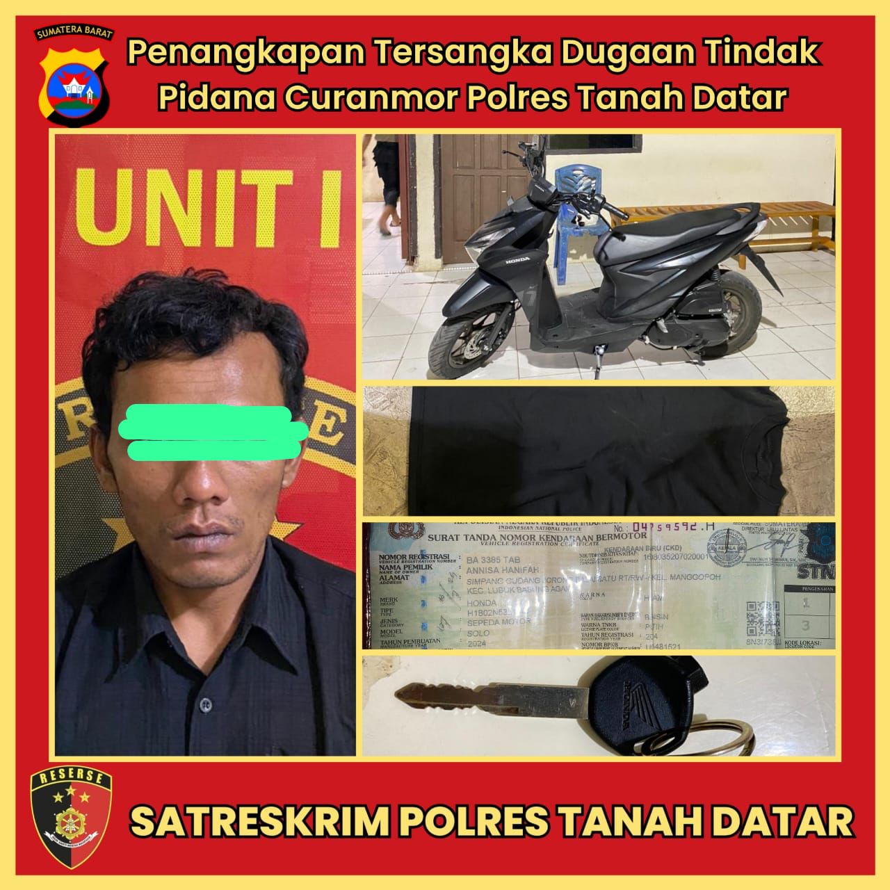 Tersangka berinisial CS (33) diduga melakukan pencurian kenderaan bermotor di depan kos kosan Jorong Kubu Rajo Nagari Limo Kaum Kecamatan Lima Kaum Kabupaten Tanah Datar tepatnya di belakang Swalayan Katara Mart.